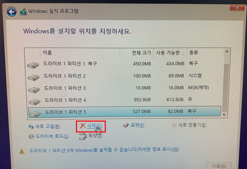 먼저, 각 파티션을 다 삭제한다.