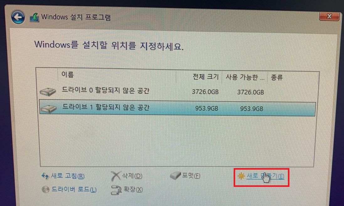 그리고, 윈도우를 설치할 곳을 클릭한 후 새로 만들기를 누른다.
