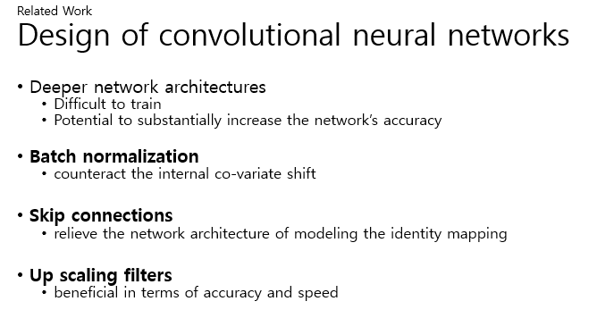 Deeper network architectures은 훈련하기가 어려울 수 있지만, 매우 높은 복잡도의 모델링 매핑을 허용하기 때문에 네트워크의 정확성을 크게 높일 수 있는 가능성이 있다고 한다. 이러한 Deeper network architecture들을 효율적으로 학습시키기 위해 Batch normalization이 사용되는데, 내부의 Co-variate shift를 막기 위해 사용된다. 또한, Skip connections는 Network architectur을 완화시키고, Up scaling filter은 정확도와 스피드에 있어서 향상되게 하였다.