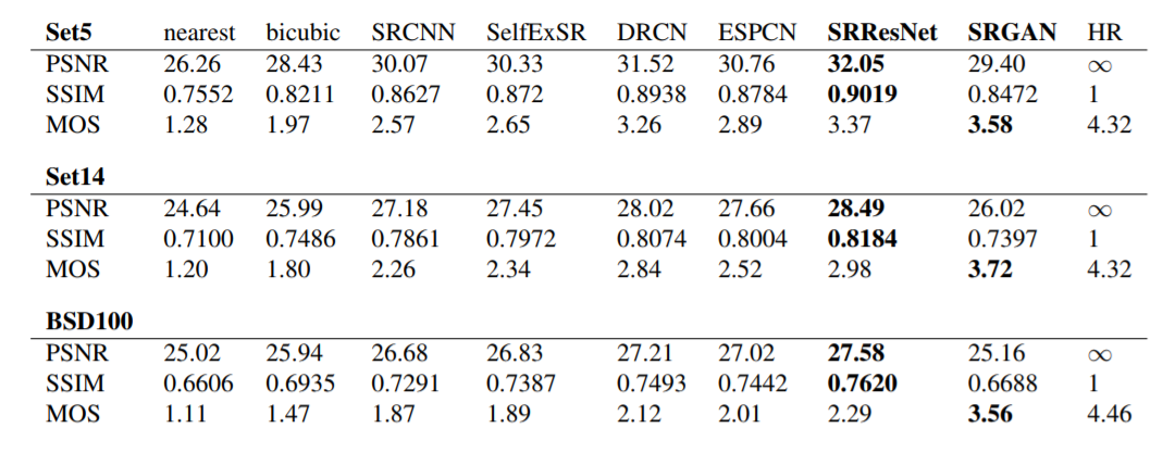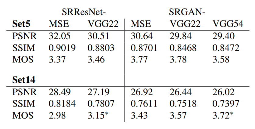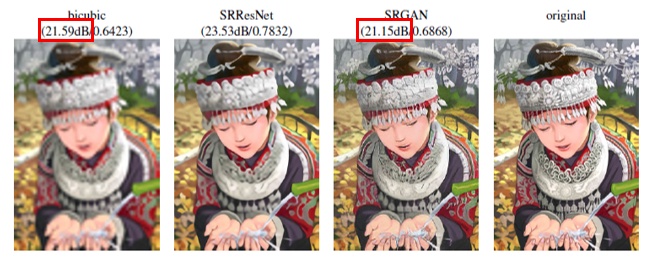 일반적으로 재구성된 SR 이미지에서는 보통 High frequency detail들이 부족하기 때문에 High upscaling factors에서 문제가 드러난다. 이를 위해 보통, MSE를 최소화시켜 PSNR을 최대화시키는 방법을 사용하는데, 이것이 꼭 좋은 SR 결과를 나타내는 것은 아니다. MSE는 픽셀 이미지의 차이를 기반으로 두었기 때문에 High texture detail같은 것들에는 제한적이다. 아래에 있는 사진에서 왼쪽의 수치값이 PSNR이고 오른쪽의 수치값이 SSIM 값이다. PSNR은 최고 신호의 전력대비 손실을 나타내고, SSIM은 구조적 유사지도로서 두 값들은 보통 Resolution을 나타낼 때 많이 쓰이는 정량적인 값이다. 이 때, Bicubic 이미지와 SRGAN 이미지를 비교하였을 때 SRGAN의 PSNR 값이 더 작음에도 불구하고 훨씬 더 좋은 resolution을 보이는 것을 알 수 있다.