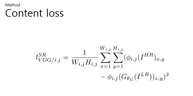 따라서 이 논문에서는 19계층의 vgg 네트워크의 ReLU 활성화 계층을 기반으로 VGG의 손실을 정의한다. 이 방법은 pre trained된 vgg net을 이용해서 feature map에서의 유클리드 거리(reference image 와 reconstructed image의 유클리드 거리 값)를 계산하는 방법이다. 따라서 pixel의 값에 중심을 두기보다 perceptual similarity를 주목하였기 때문에 보다 detail한 부분을 잘 잡아낼 수 있을 것으로 보인다.
