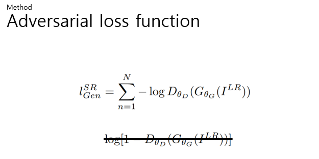 Generator가 Discriminator 모델을 속임으로써, Natural image와 비슷하게 만들 수 있도록 Content loss에 Adversarial loss를 더해준다. 이 Adversarial loss는 Discriminator가 Low resolution에서 생성된 이미지를 Natural high resolution image라고 구별할 확률을 기반으로 정의한다. 또한, 더 나은 동작을 위해서 Log를 1에서 뺀 것을 최소화시키는 것이 아닌 위의 식을 최소화시킨다.