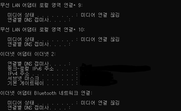 그리고, 명령 프롬프트에 ipconfig 명령어를 쳐주면, 다음과 같이 ip를 확인할 수 있다.