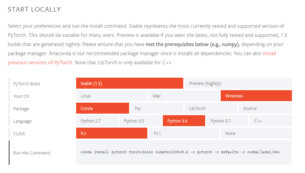 다시 위의 사진에서 맞는 python 버전과 CUDA 버전을 선택하면 아래의 Run this Command가 바뀌고, 이를 Anaconda prompt에 돌린다. (혹시 9.0이라면 9.2를 선택해서 cudatoolkit=9.2 부분을 9.0으로 바꾼다.)