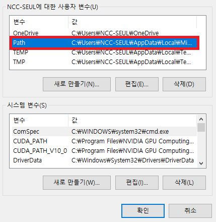 이 중 아래 빨간 박스 안의 Anaconda PATH를 추가한다.