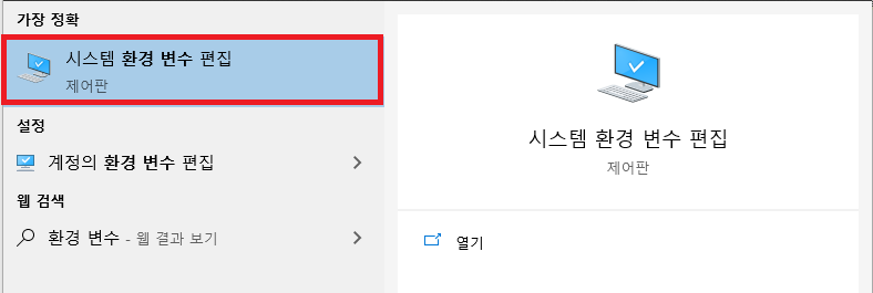 윈도우 검색에 환경 변수를 검색하면 다음과 같이 시스템 환경 변수 편집으로 들어갈 수 있다.