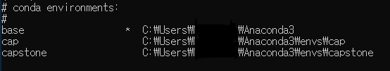 해당 가상환경을 활성화 시킨다면 바로 conda list를 하면 되고, base에서(비활성화 상태) 보고 싶다면 뒤에 이름을 붙이면 된다.