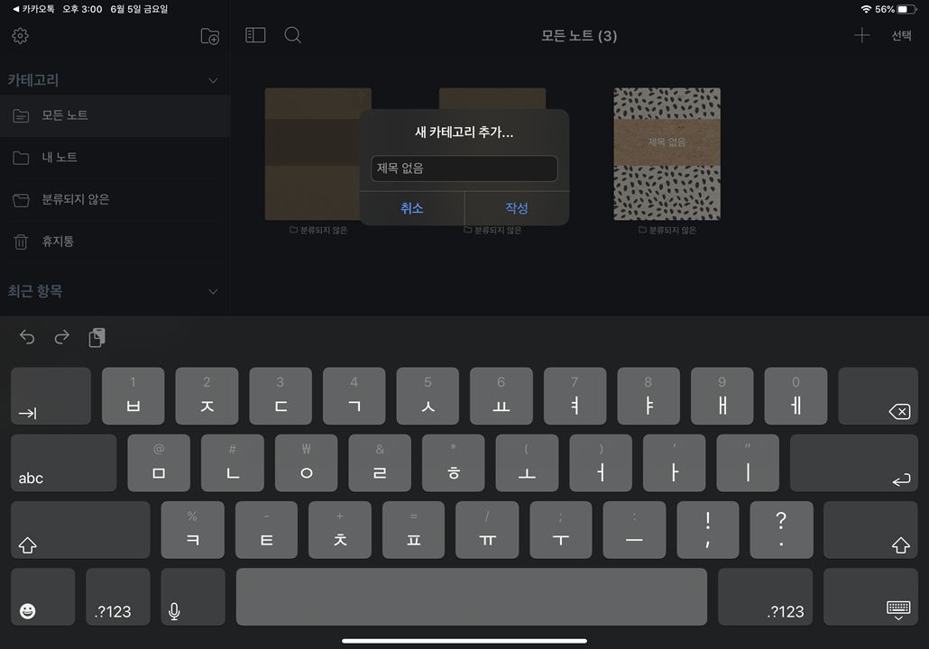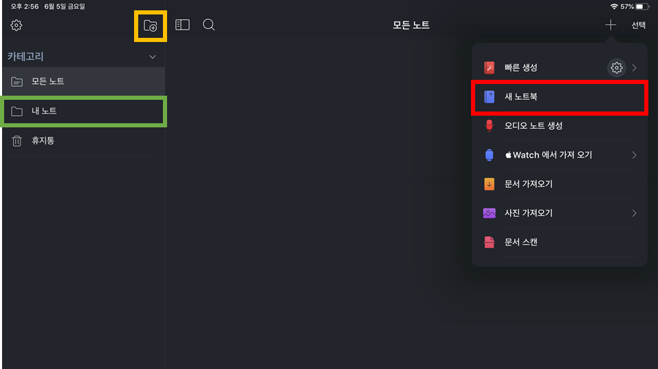어플을 시작하면 다음과 같은 홈 화면이 나온다. 새 노트북을 생성하고 싶으면 오른쪽의 빨간 박스인 [새 노트북]을 누르면 된다. 또한, 이렇게 생성된 노트북들을 카테고리 안에 넣고 싶다면 먼저 카테고리를 생성해야하는데 노락색 박스안의 아이콘을 누르면 된다. 그러면, 초록색 박스처럼 새로운 카테고리가 생긴다. 노트북을 원하는 카테고리에 넣고 싶으면 꾹 눌러서 원하는 카테고리 안에 넣으면 된다.