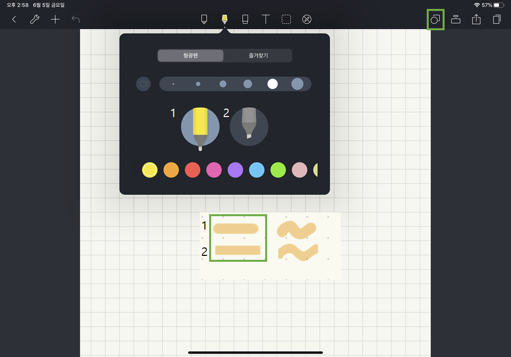 형광펜 도구는 다음과 같이 두가지 형태로 분류되고, 이는 다른 어플들과 제일 특화되게 다른 점이다! 끝이 둥근 형태와 평평한 형태로 나뉘어 있다. 또한, 위의 펜 도구와 마찬가지로 모양 아이콘을 활성화 시키면 아래 초록색 박스와 같이 곧은 형태로 그릴 수 있다.
