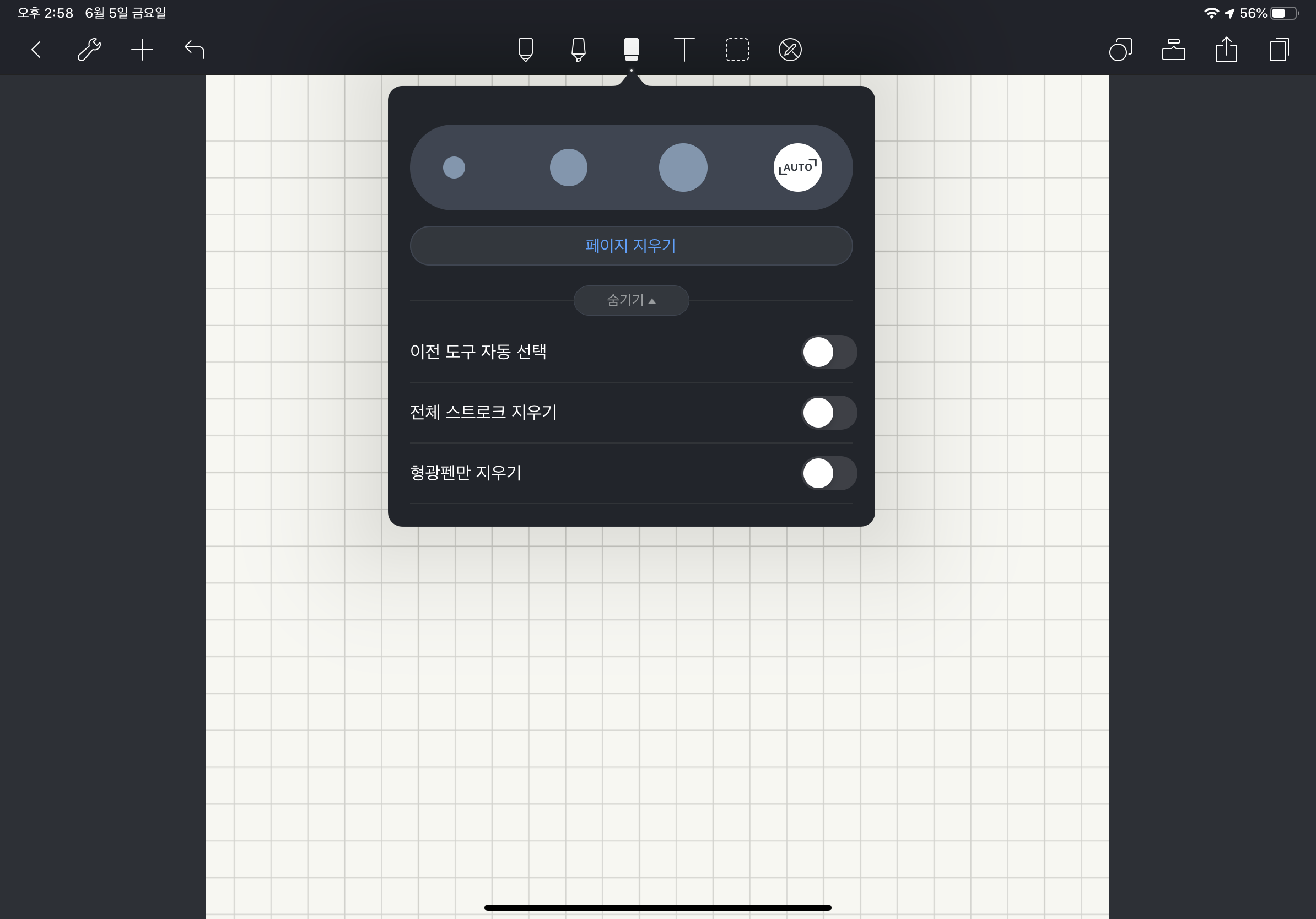 지우개 툴은 아래와 같이 전체 페이지를 지우는 기능과 형광펜만 지우는 기능이 있다. 또한, 이전 도구 자동 선택을 활성화 시키면, 펜을 사용하다가 지우개로 지우다가 화면에서 펜슬을 떼는 순간 펜으로 바꾸지 않아도 자동으로 펜으로 바뀐다.