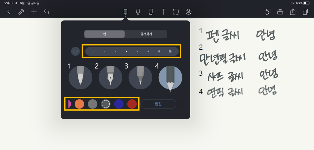 펜 도구는 다음과 같이 네 가지 종류로 이루어져 있다. 펜, 만년필, 샤프, 연필 과 같은 종류로 각각 생김새가 다음과 같이 다르다. 이 중 특히 만년필과 샤프가 필기할 때 글씨도 잘 써지고 좋은 것 같다. 또한, 굿노트와 노타빌리티에 비해서 삐침이 굉장히 적고 필기감이 좋았다.
