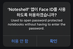 또한, 노트쉘프의 한가지 신기한 점은 각각 노트북마다 암호 설정을 할 수 있다는 점이다. 다음과 같이 [설정] 탭의 [비밀번호 잠금]을 활성화 시키면 다음과 같이 암호를 설정할 수 있는 창이 뜬다. 이때 아래의 Face ID로 열기(아마도 프로 3세대 이후...의 경우인듯??) 를 활성화시키면, 암호 해제를 Face ID로 할 수 있다.