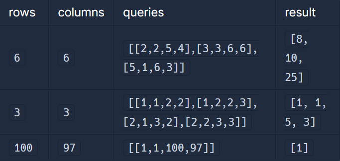 - 1 ≤ x1 < x2 ≤ rows, 1 ≤ y1 < y2 ≤ columns입니다.