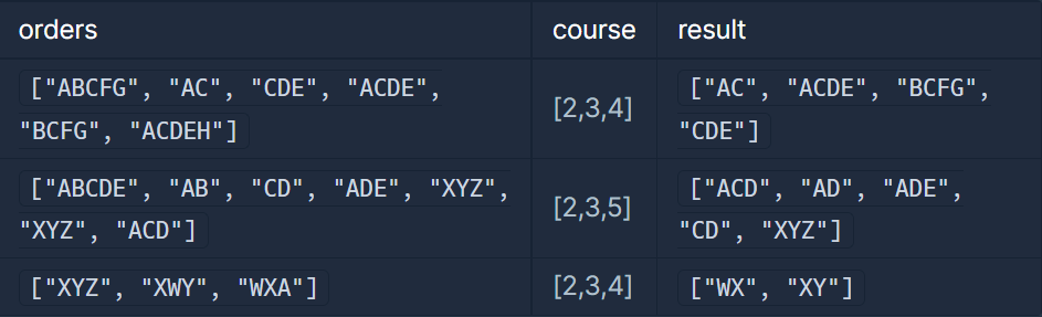 - orders와 course 매개변수는 return 하는 배열의 길이가 1 이상이 되도록 주어집니다.