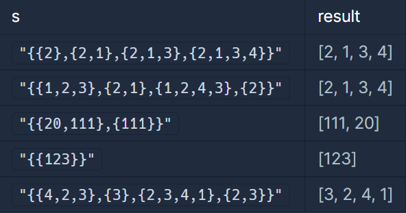 입출력 예 #5(3, 2, 4, 1)을 집합 기호를 이용해 표현하면 {{3},{3,2},{3,2,4},{3,2,4,1}}이 되며, 이는 {{4,2,3},{3},{2,3,4,1},{2,3}}과 같습니다.